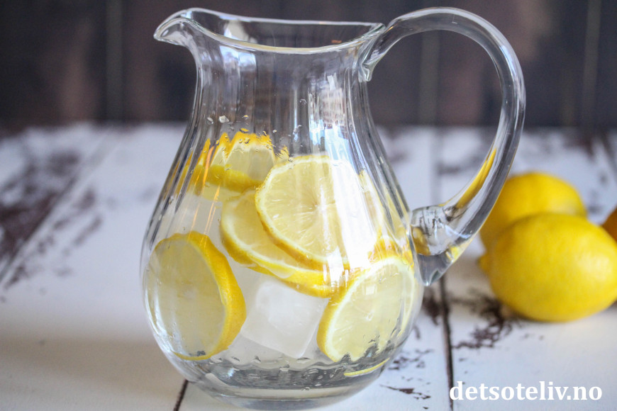 Pass på at du får med deg isbit og sitronskive i glasset også. Limonaden er best når den er iskald!