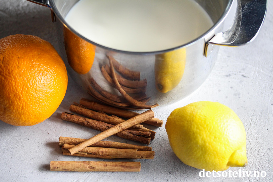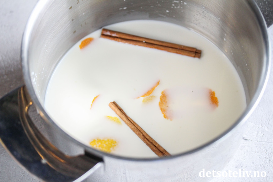 Hell melken i en kjele. Skjær av noen remser appelsinskall og sitronskall (se tips), og ha dette i kjelen sammen med kanelstenger. Gi melken et oppkok. Ta kjelen av platen og la den stå og strekke i 20 minutter.