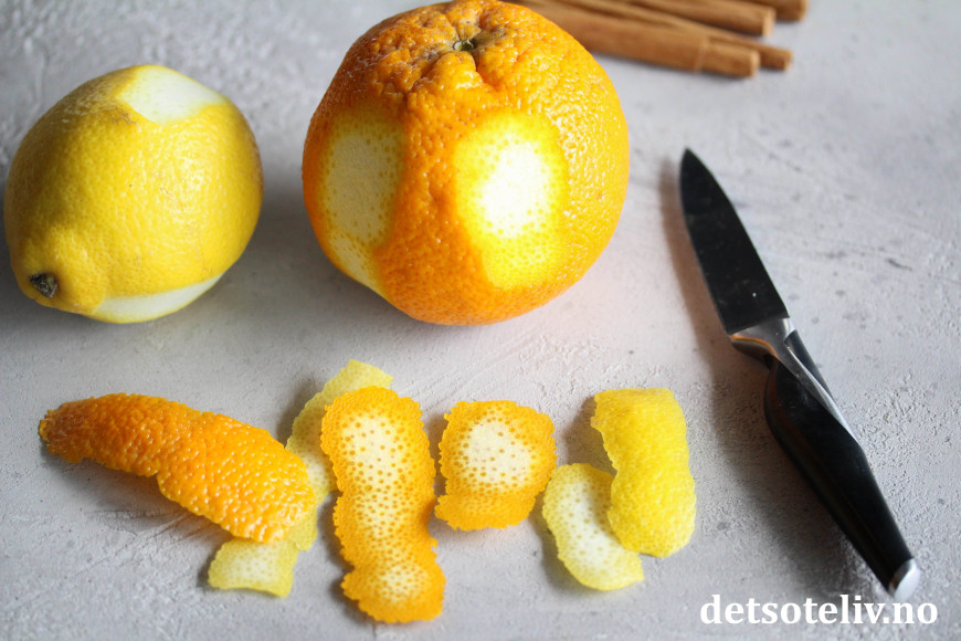 ♥ Remser av sitron- og appelsinskall skjærer du med en liten, skarp kniv. Pass på at du får med minst mulig av det hvite under skallet, fordi det kan gi bitter smak på desserten. Bruk helst økologisk sitron og appelsin, så unngår du sprøytemidler i skallet.