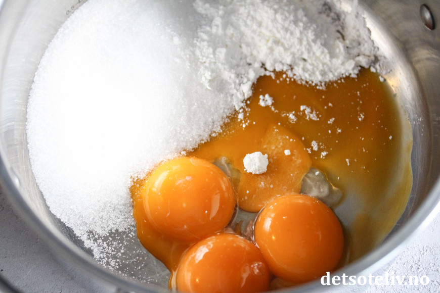 Visp eggeplommer, sukker og maisenna lett sammen i en annen kjele (konsistensen blir som en tykk grøt).