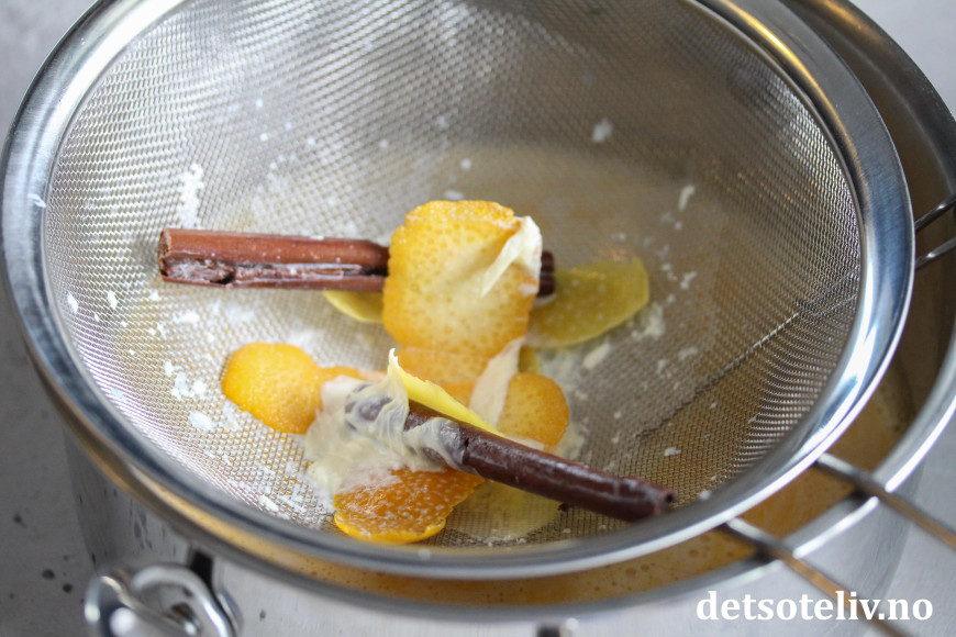 Sil deretter melken slik at du får fjernet sitrusskall og kanelstenger, og ha melken så tilbake i kjelen. Varm opp melken på nytt til den når kokepunktet. Ta kjelen av platen.