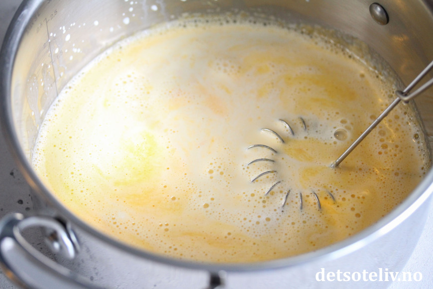 Hell litt av den varme melken i eggemassen, og rør godt så blandingen blir jevn. Spe med litt mer av den varme melken og rør videre. Gjenta til all melken er blandet inn.