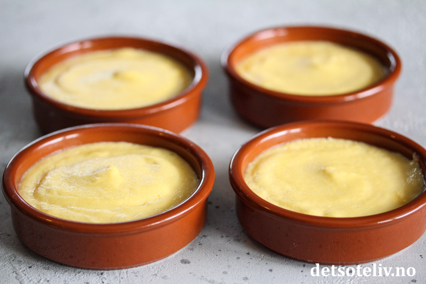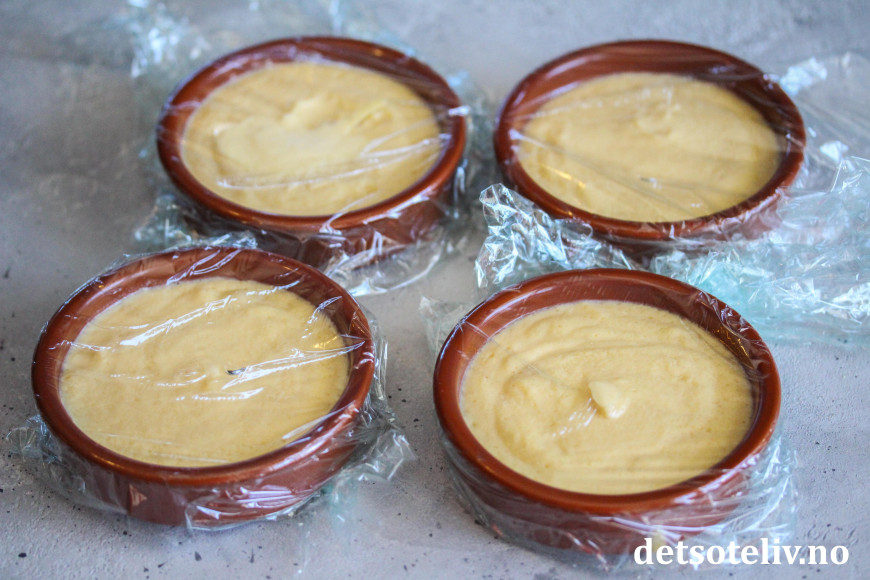 Ta kjelen av platen og fordel den varme kremen i 4 dessertskåler. Dekk skålene med plastfolie og sett dem i kjøleskapet i minst 4 timer, og gjerne over natten.