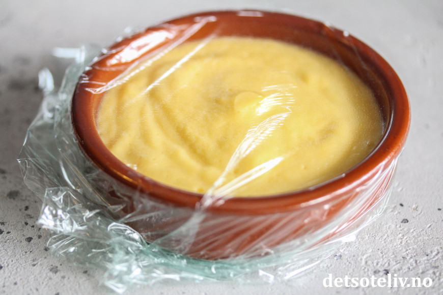 Visp eggeplommer, sukker og maisenna lett sammen i en annen kjele (konsistensen blir som en tykk grøt). Hell litt av den varme melken i eggemassen, og rør godt så blandingen blir jevn. Spe med litt mer av den varme melken og rør videre. Gjenta til all melken er blandet inn.