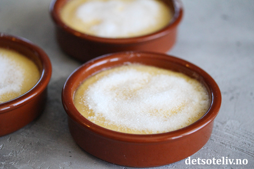 Før servering tas dessertene ut av kjøleskapet. Fjern plastfolien. Dryss et tynt og jevnt lag finkornet sukker over kremen i skålene.