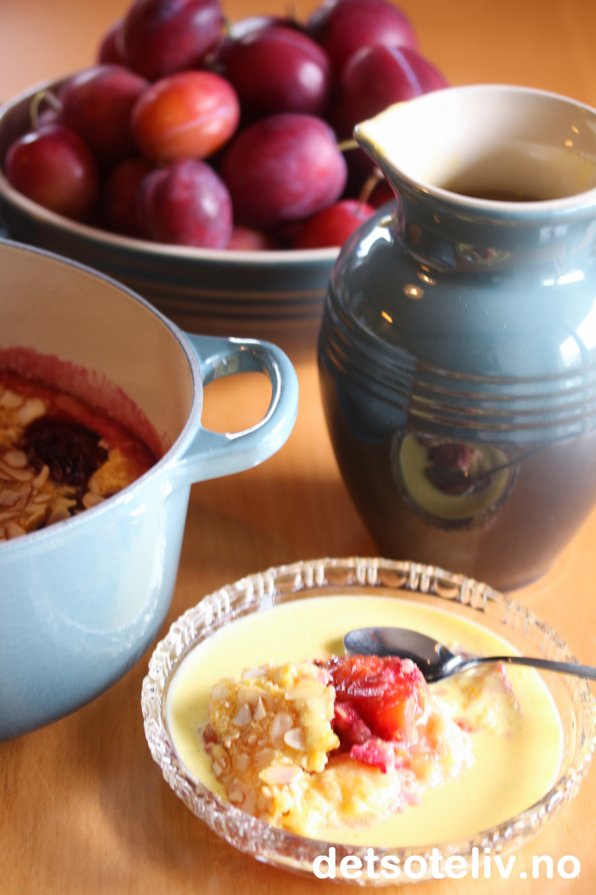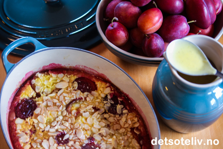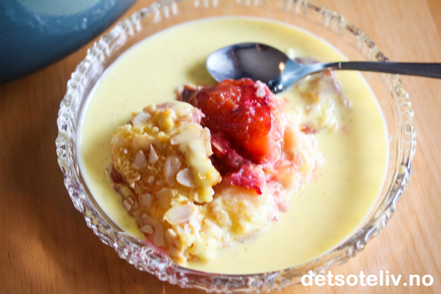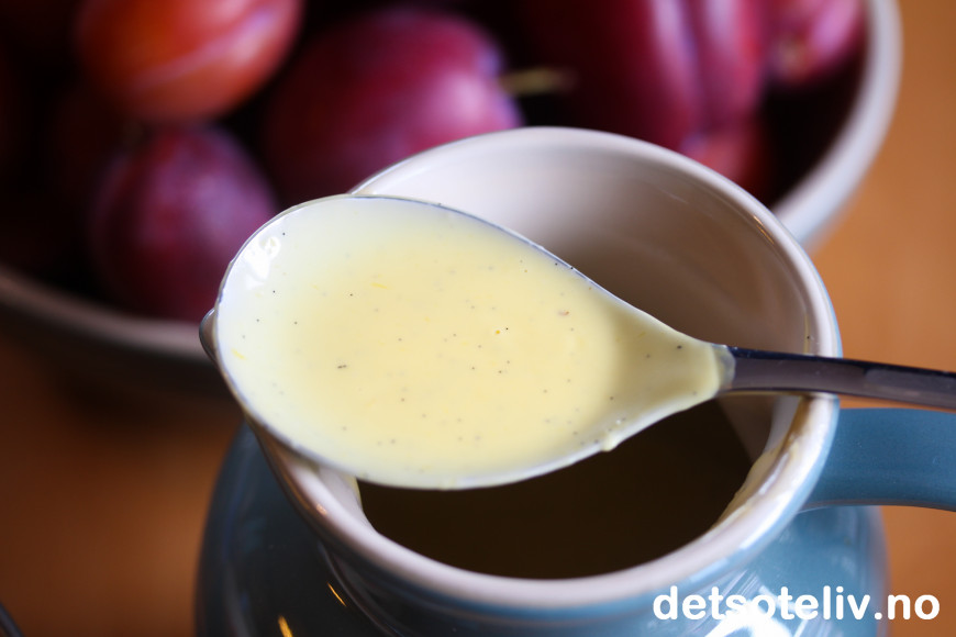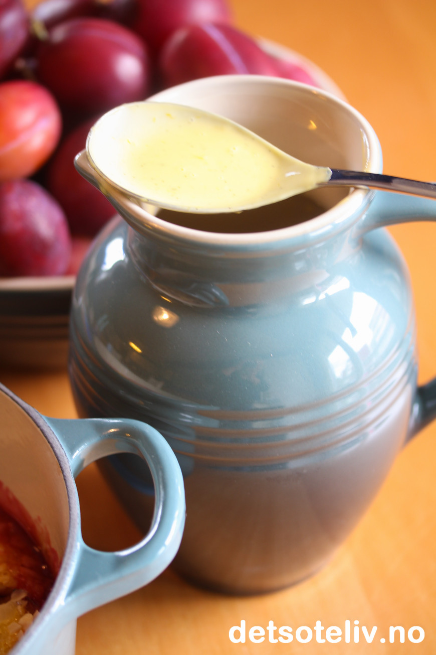 ♥ Her har jeg servert vaniljesausen sammen med en deilig fransk Plomme Clafoutis. Oppskriften på denne nydelige dessertgratengen kommer her på Det søte liv i morgen.