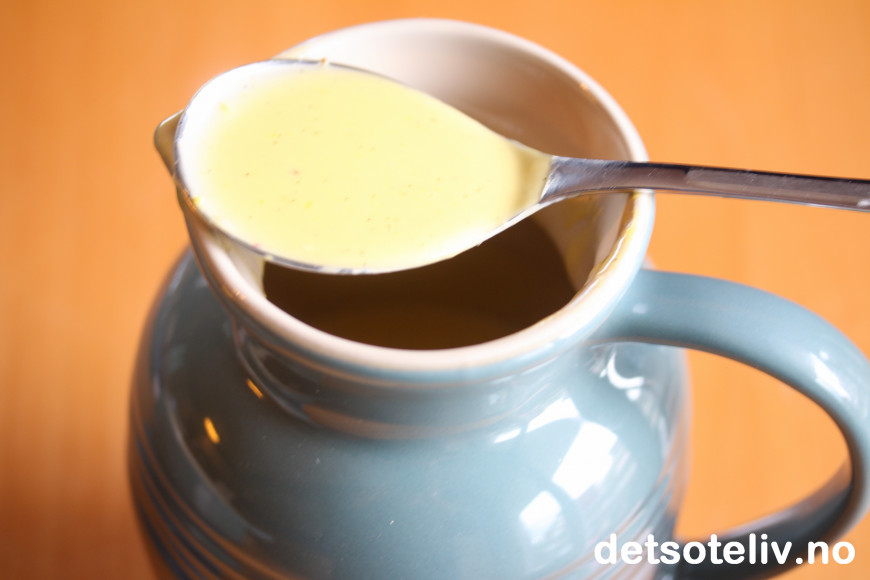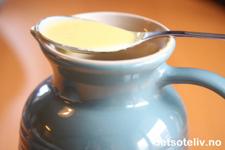 Ta kjelen av platen og avkjøl vaniljesausen litt før du heller den på en mugge.
