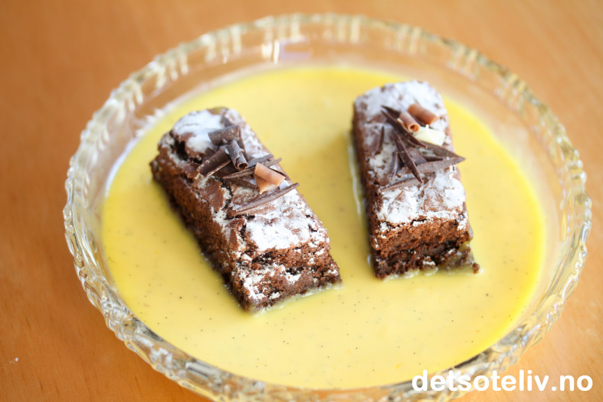 Deilig med vaniljesaus til sjokoladebrownies...!