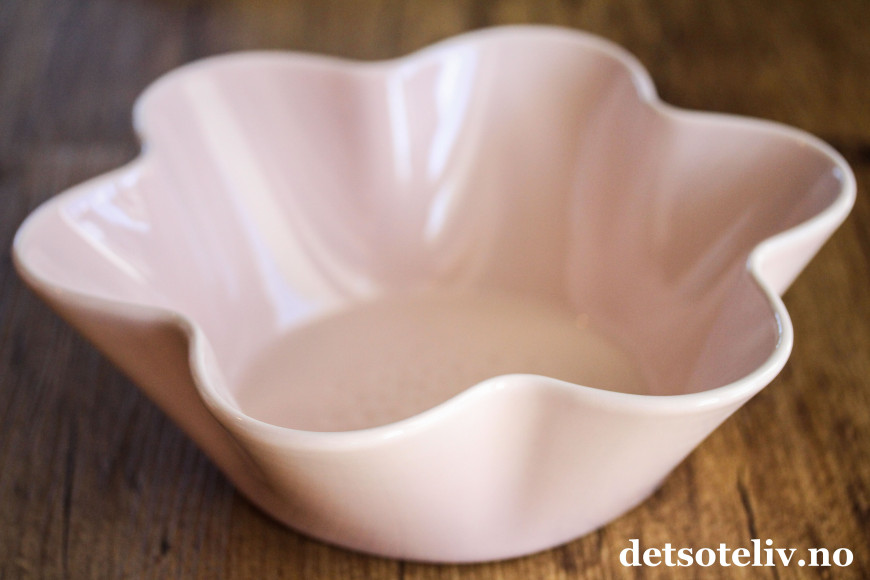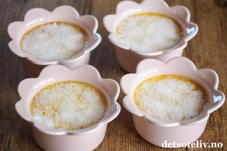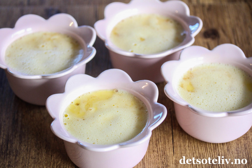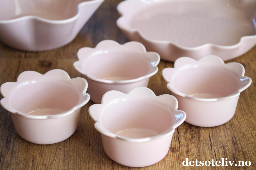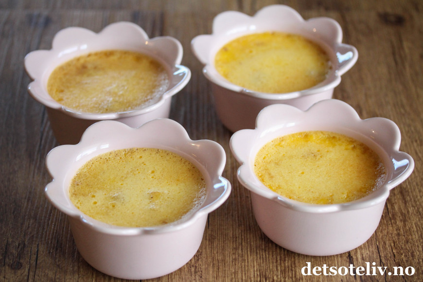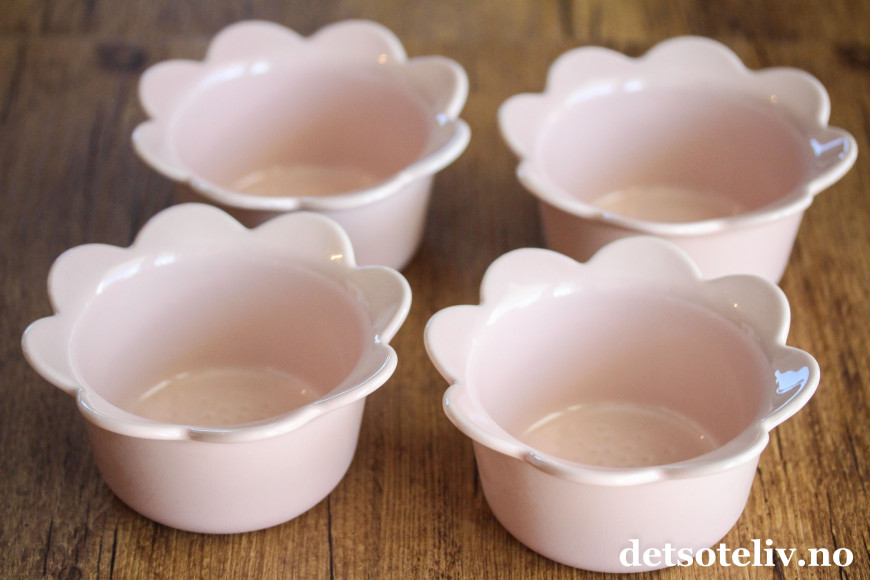 ♥ Ikke la deg skremme av at desserten skal stekes i vannbad. Det er ikke verre enn at du setter skålene i langpannen, koker opp vann i vannkokeren og heller vannet forsiktig i langpannen.
