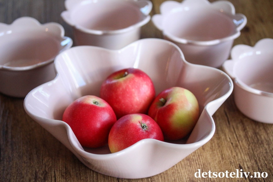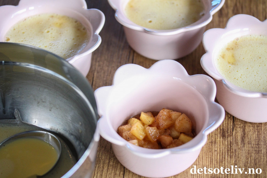 Jeg kokte eplebiter møre med sukker og kanel og la i bunnen av formene før jeg helte over vaniljefløten og satte formene i ovnen. Resultatet ble nydelig!