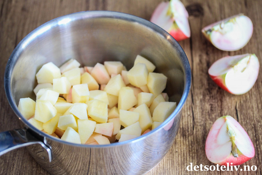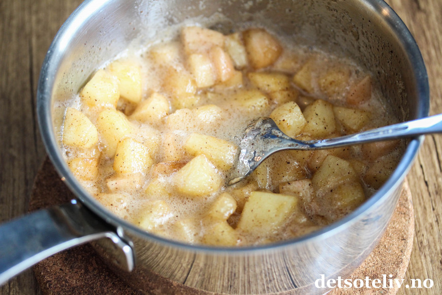 Varm opp eplebitene og la blandingen småkoke i noen få minutter, til eplebitene kjennes møre.