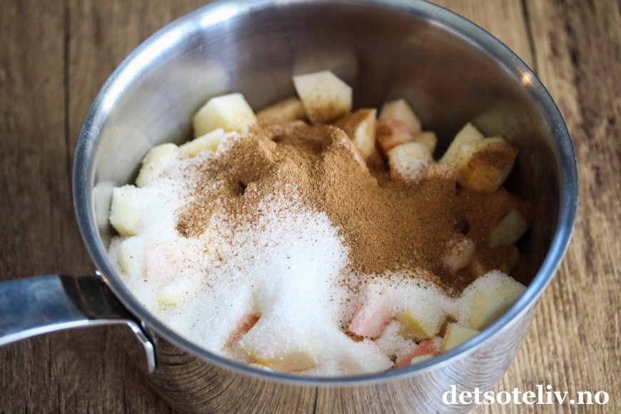 Ha eplebitene i en kjele sammen med sukker og kanel.