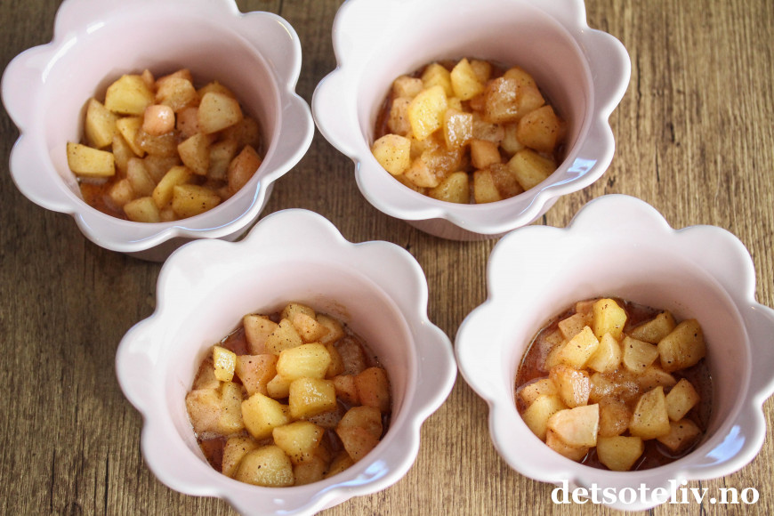 Avkjøl litt og fordel eplebitene i skålene (ta bare med litt av sausen, ellers blir crème brûléen for flytende).