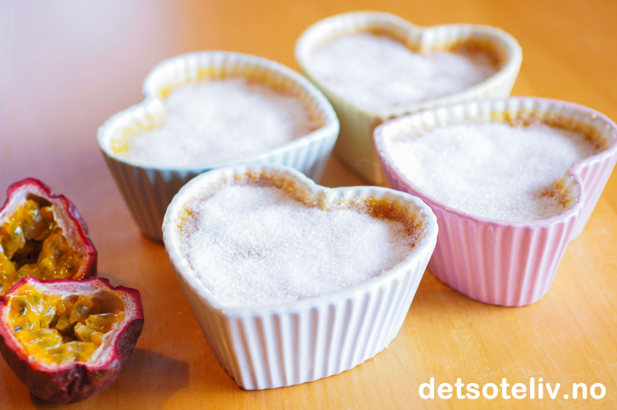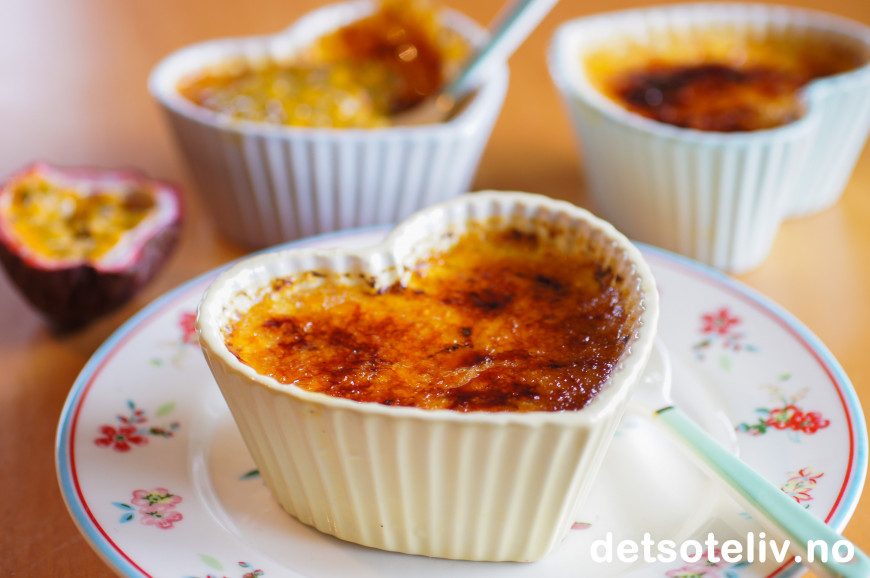 "Crème brûlée" er denne verdensberømte, franske desserten med sukkerlokk som skal knase lett når du stikker skjeen din ned i desserten. Jeg har tidligere laget varianten som du finner her. Desserten kan varieres med mange forskjellige smakstilsetninger, og pasjonsfrukt er en av de beste alternativene.