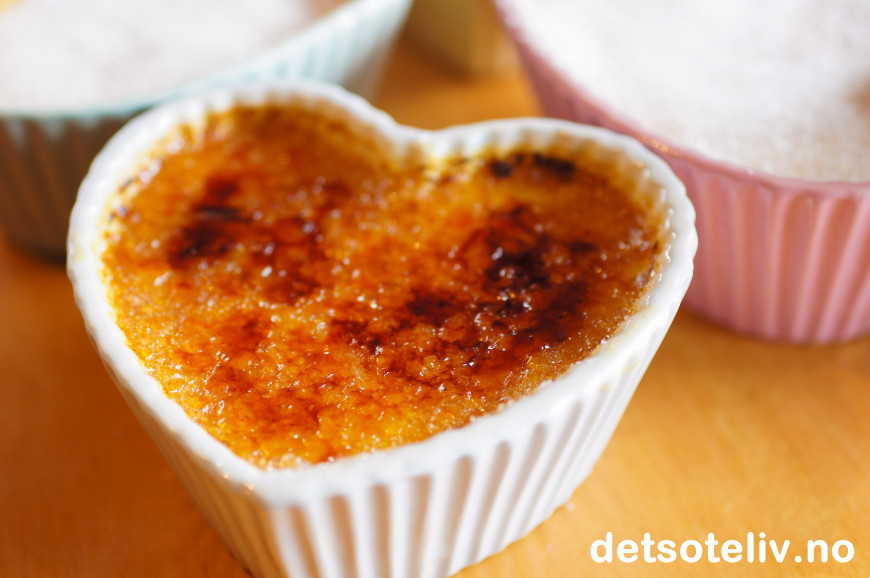 ♥ Ikke la deg skremme av at du må bruke gassbrenner heller. Gassbrenner fås kjøpt i de fleste velassorterte kjøkkenutstyrsbutikker (husk å kjøpe både brenner og gass til å fylle på brenneren). Billige varianter fås blant annet kjøpt hos Jernia og Clas Ohlson. Bruker du grillen i ovnen, må du passe nøye på så desserten ikke står så lenge i ovnen at den smelter og sukkeret blir brent. Følg nøye med hele tiden!