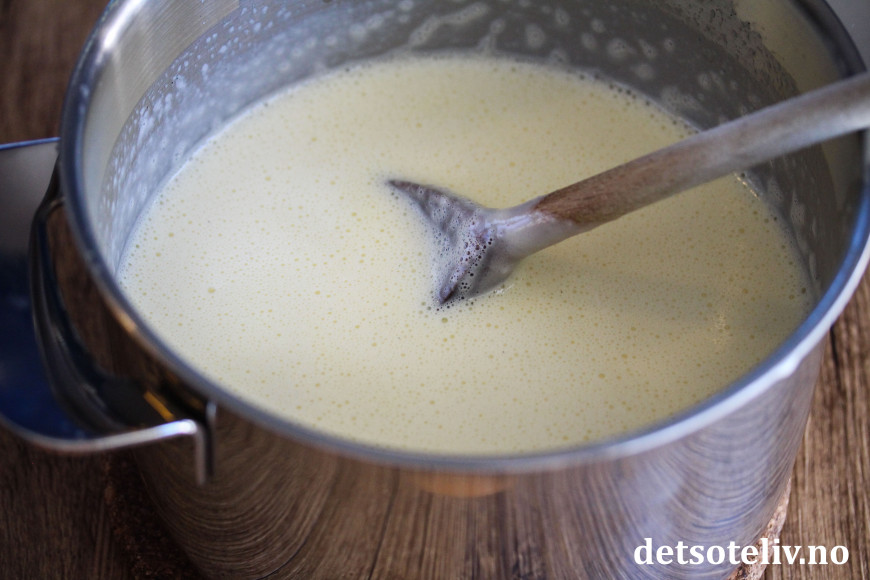 Ha kremfløte, melk og vanilje i en kjele. Gi blandingen en raskt oppkok og ta kjelen av platen.