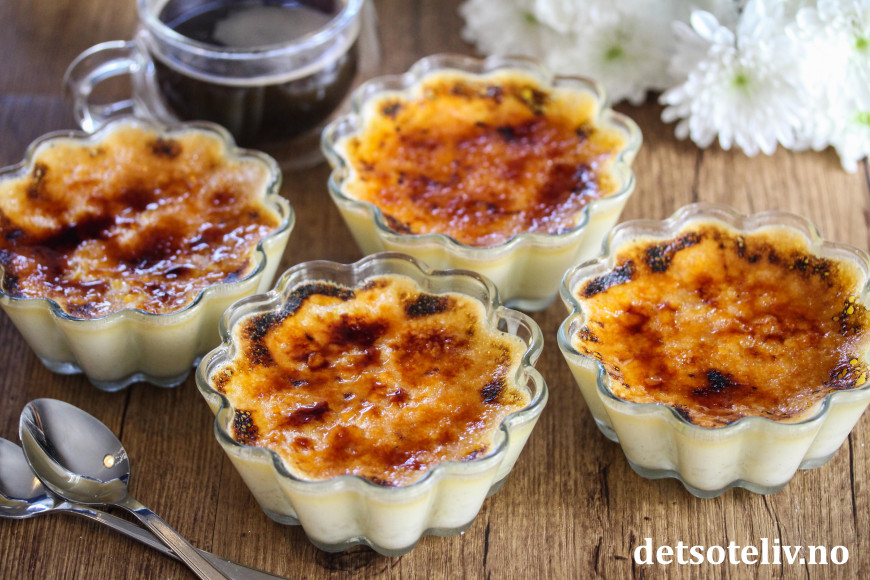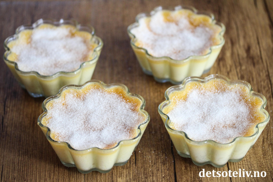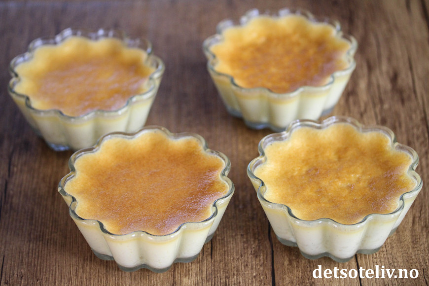 Rett før servering drysses sukker på toppen av dessertene, ca 1 spiseskje på hver. Varm sukkeret slik at det smelter enten med en gassbrenner, eller ved å sette dessertene en kort stund høyt oppe i ovnen som er varmet opp til grillvarme.