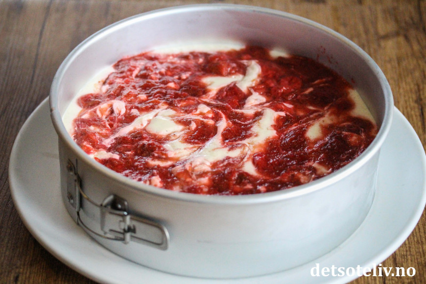 Ta så den kalde kompotten ut av kjøleskapet. Fordel kompotten på ostefyllet med en spiseskje, og dytt det ned i ostefyllet i noen groper, slik at det får et dekorativt, marmorert mønster.