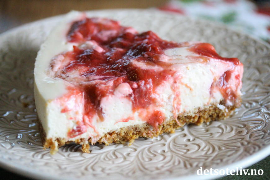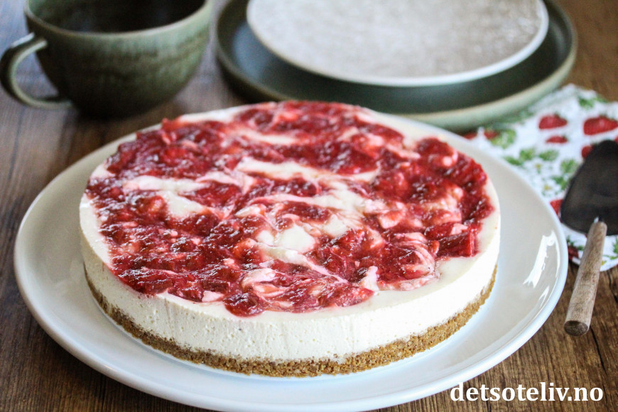 Kombinasjonen rabarbra og jordbær er noe jeg aldri blir lei. I denne kremete ostekaken kommer smakene virkelig til sin rett!