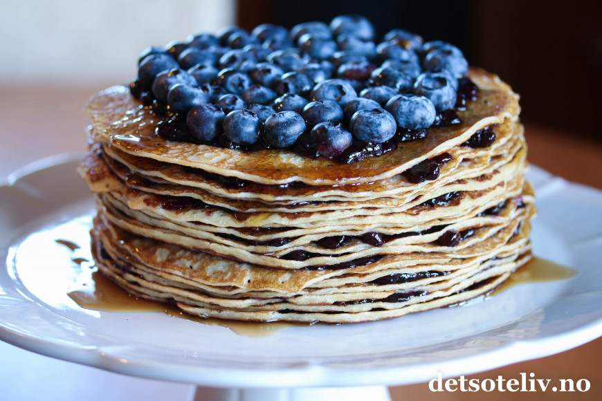 ♥ Merk at blåbærsyltetøylaget mellom hver pannekake må smøres temmelig tynt. Dette gjelder særlig hvis du stabler kaken veldig høyt, ellers kan kaken lett rase sammen når du skjærer i den. Jeg tok nok litt for mye syltetøy til en såpass høy kake, men det gikk akkurat når jeg skar opp pannekakekaken veldig forsiktig.