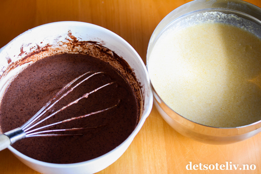 Del røren i to like store deler. Sikt kakaopulver i den ene delen og visp røren jevn.