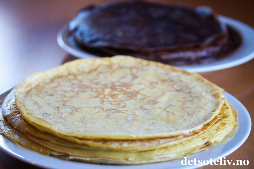 «Crêpes» er navnet på de berømte, tynne, franske pannekakene, som altså her stables i høyden til en kjempeflott pannekake-kake!