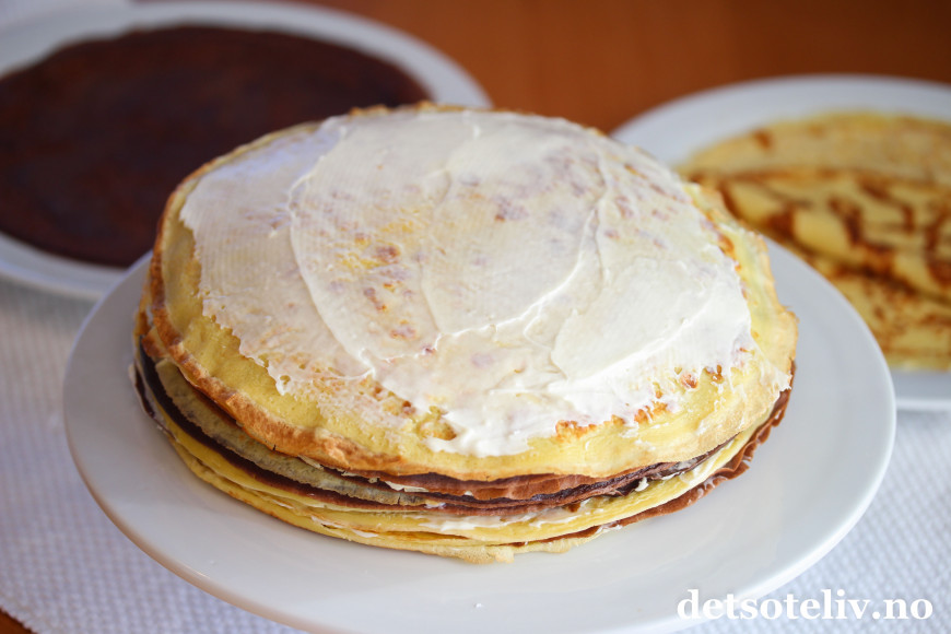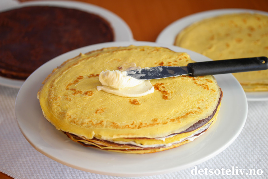 Kun et tynt lag ostekrem mellom hver pannekake.