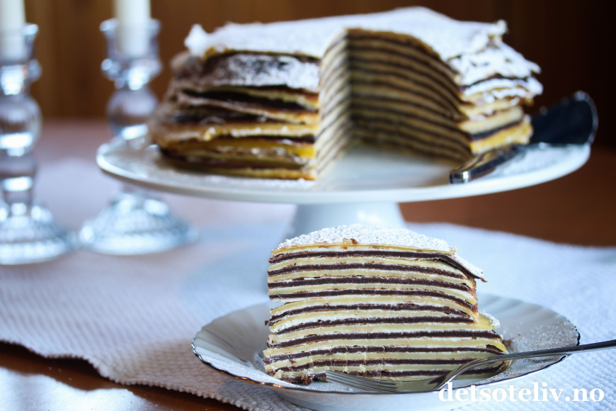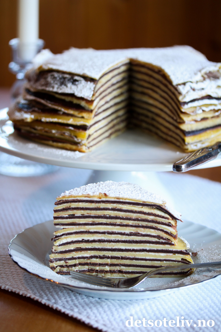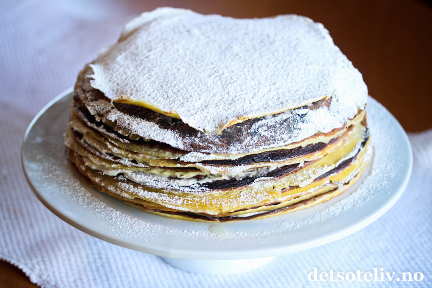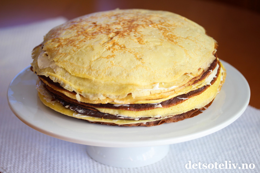 ♥ Det går an å steke pannekakene kvelden før og sette sammen kaken dagen etter. Husk da å dekke pannenkakene godt til med plast slik at de ikke blir tørre.