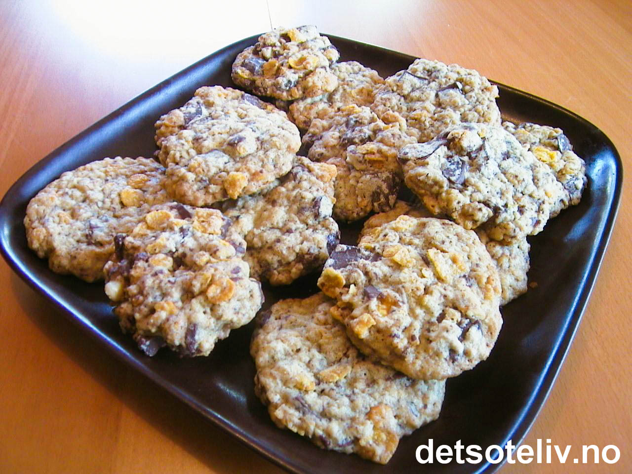 Her har du spennende og KJEMPEPOPULÆRE cookies med cornflakes, havregryn, valnøtter og store sjokoladebiter! Oppskriften gir 40 stk.