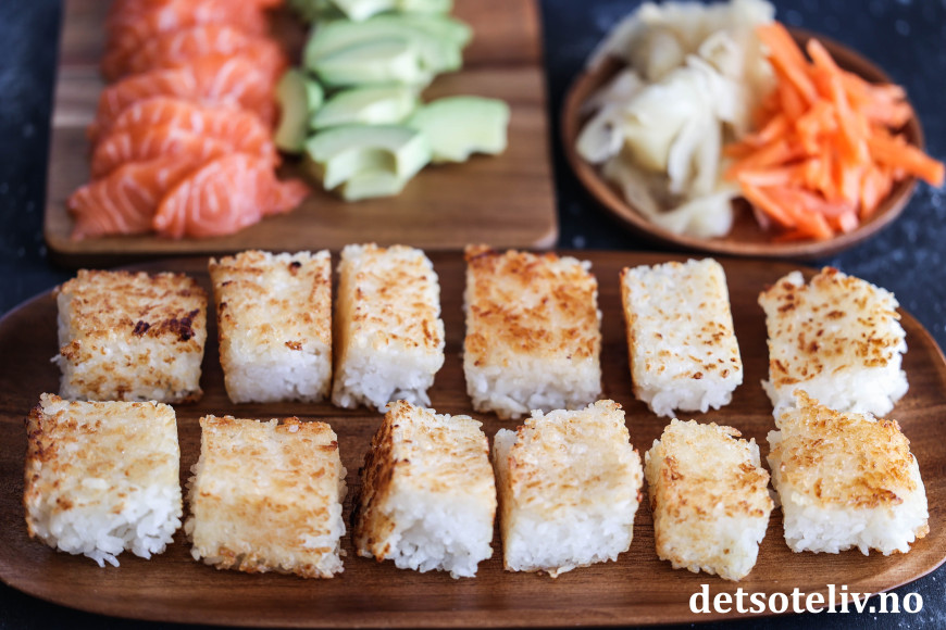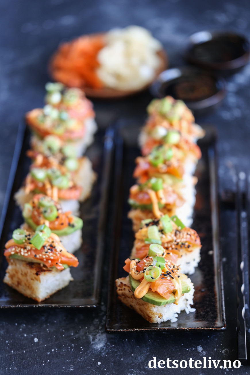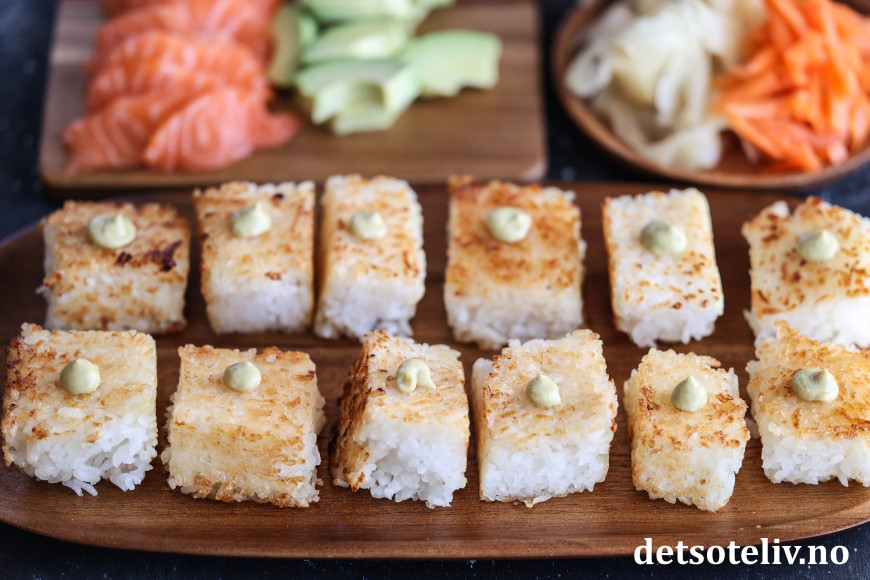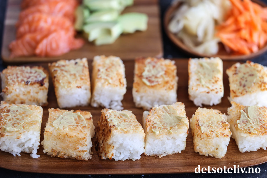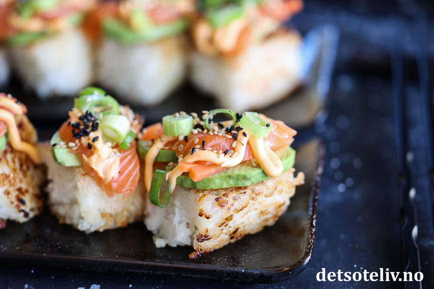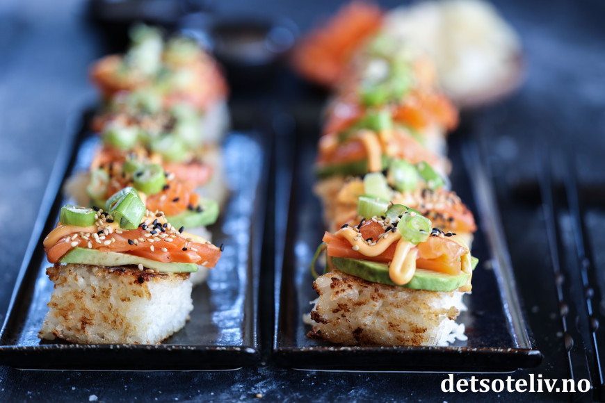 Her presses smaksatt sushiris ned i en avlang brødform som settes i fryseren. Deretter skjæres risen i firkanter som stekes sprøe i olje. De sprøstekte bitene dekkes deretter med wasabimajones, avokado, syltet gulrot, rå laks, vårløk, chilimajones og sesamfrø. Bitene blir superlekre å se på!