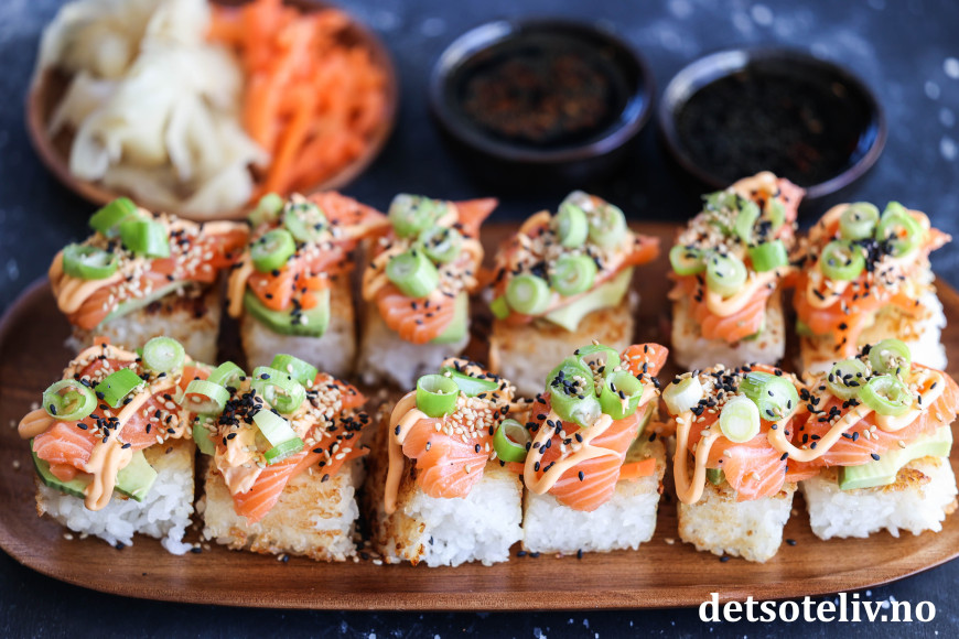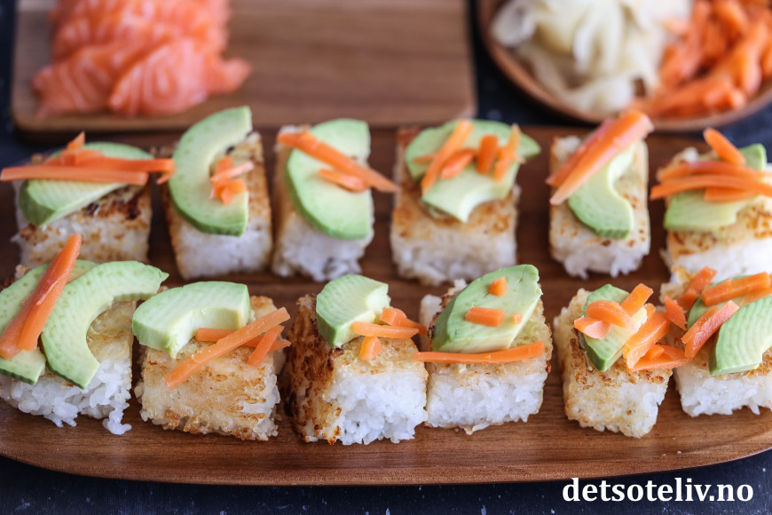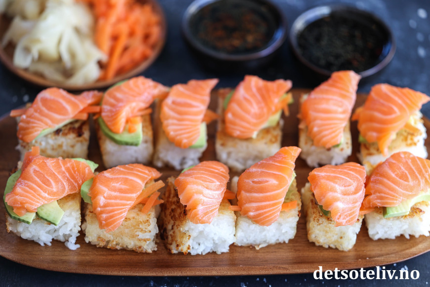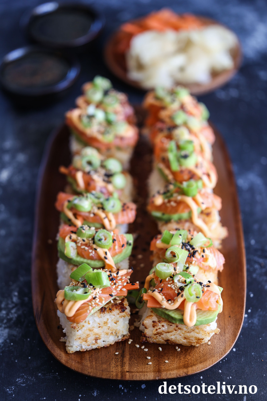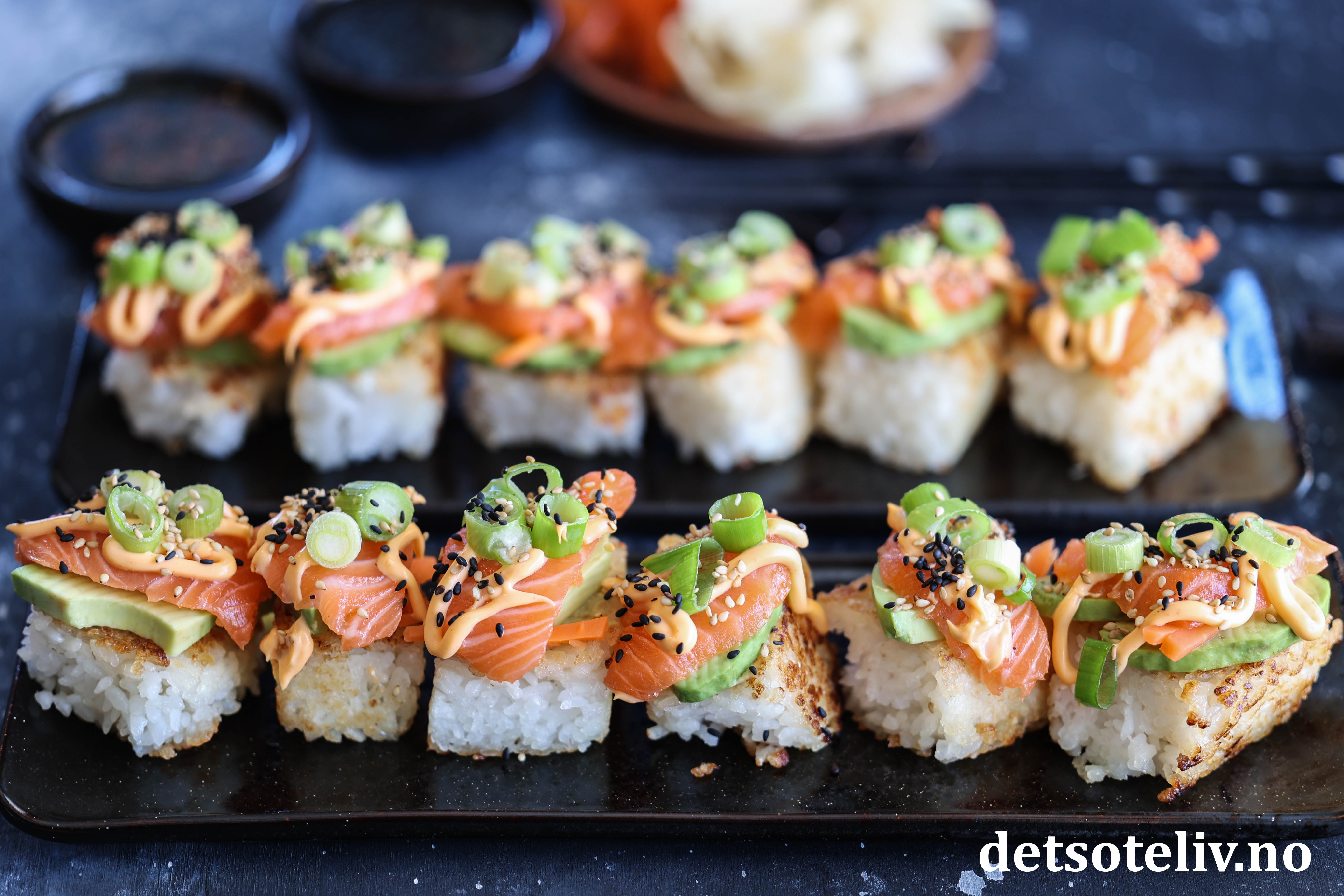 Her presses smaksatt sushiris ned i en avlang brødform som settes i fryseren. Deretter skjæres risen i firkanter som stekes sprøe i olje. De sprøstekte bitene dekkes deretter med wasabimajones, avokado, syltet gulrot, rå laks, vårløk, chilimajones og sesamfrø. Bitene blir superlekre å se på!