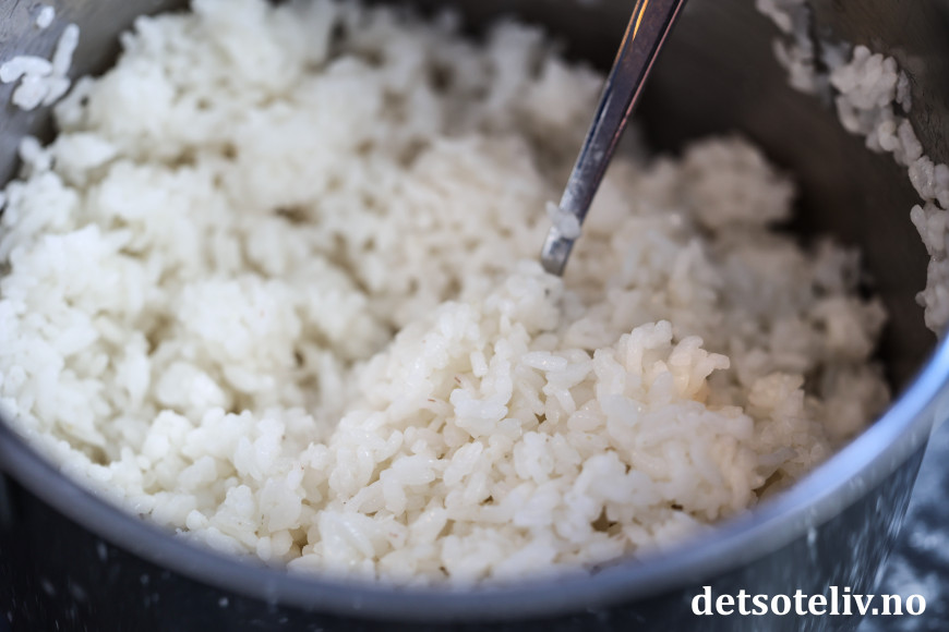 ♥ Detaljert beskrivelse om hvordan du lager sushiris finner du i dette innlegget: Sushiris (Sumeshi). Sushirisen trenger ikke å være nylaget, så det går fint å bruke rester av sushiris hvis du måtte ha det.