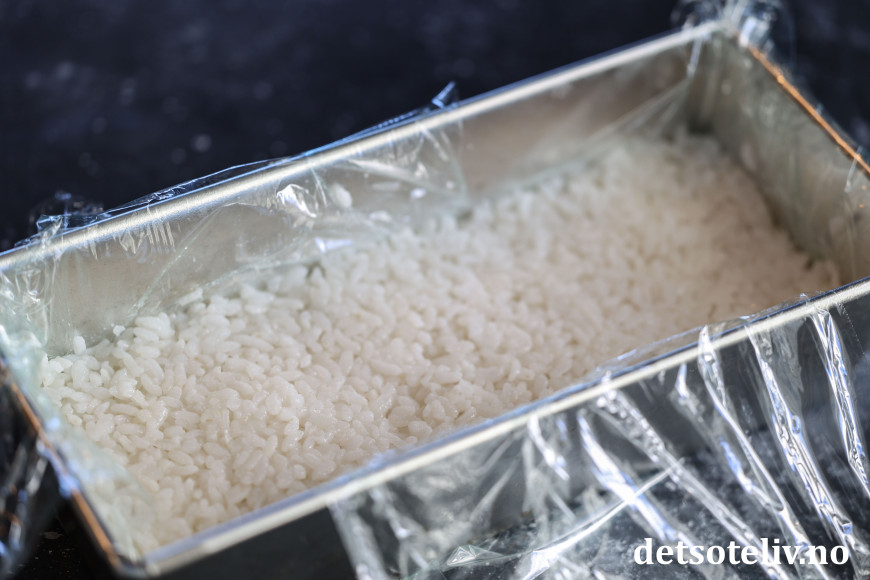 Ha sushirisen i formen og klem den godt sammen med baksiden av en spiseskje. Det er viktig at risen blir presset godt ned og blir kompakt for at risfirkantene skal holde fasongen under stekingen. Brett plastfolien over risen. Sett formen i fryseren i ca. 1 time.