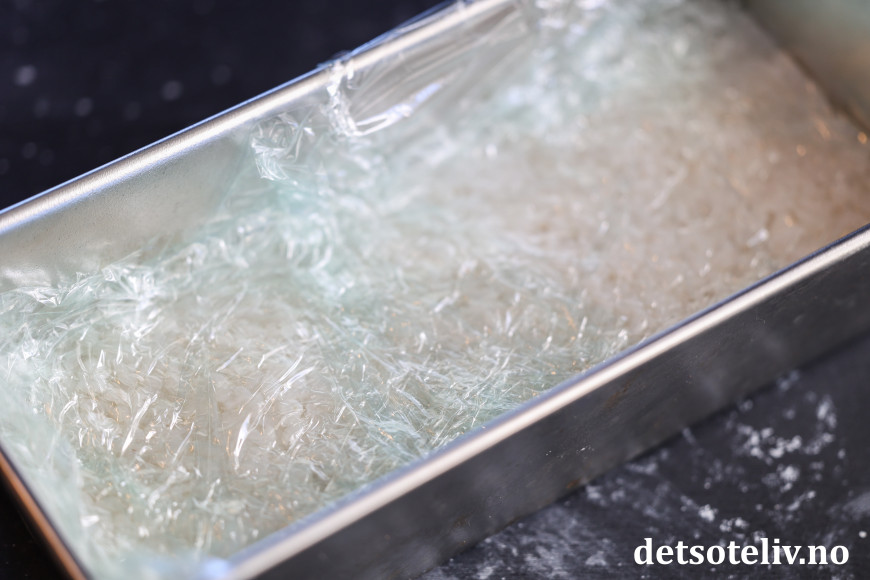 Kle en liten brødform (som rommer ca. 1 liter) med plastfolie.