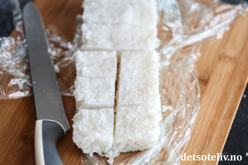 Bruk en stor kniv til å dele risblokken i firkanter (ikke for små, jeg delte i 12 biter).