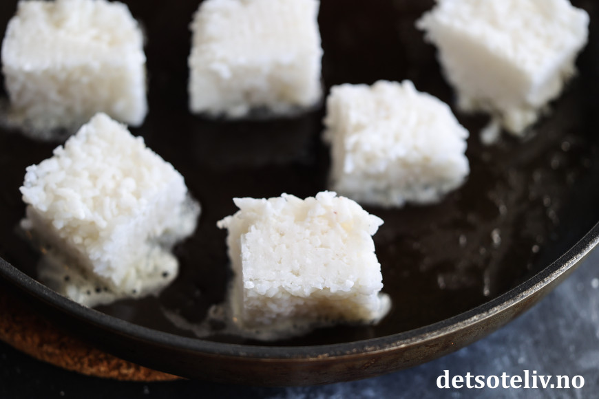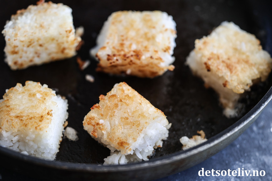 Varm opp olje i en stekepanne og stek hver risfirkant i pannen. Vend forsiktig på dem så de ikke går i stykker. Bitene skal få god stekeskorpe på alle sider.