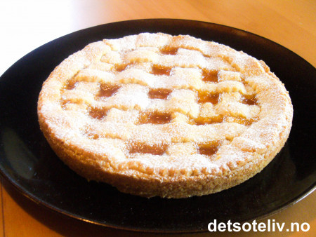 Trykk ut halve deigen i bunnen og litt oppover kantene på en godt smurt, rund form (22 cm i diameter) med bakepapir i bunnen. Smør på syltetøyet i et jevnt lag. Kjevle ut resten av deigen og lag remser med bakkelspore. Bruk remsene til å lage gittermønster på toppen av kaken.