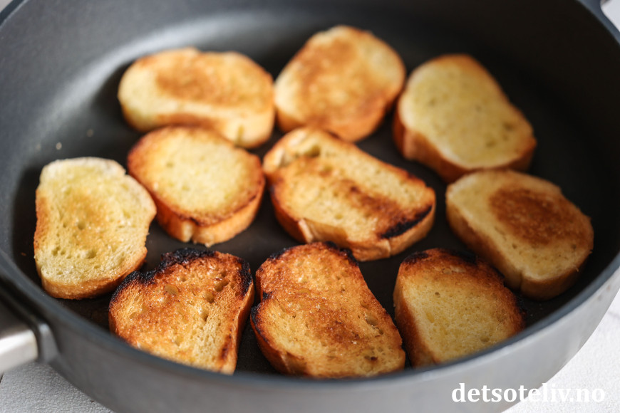 Smør baguetteskivene med smør på begge sider. Legg skivene i en stekepanne og stek dem sprø og gylne på middels varme.