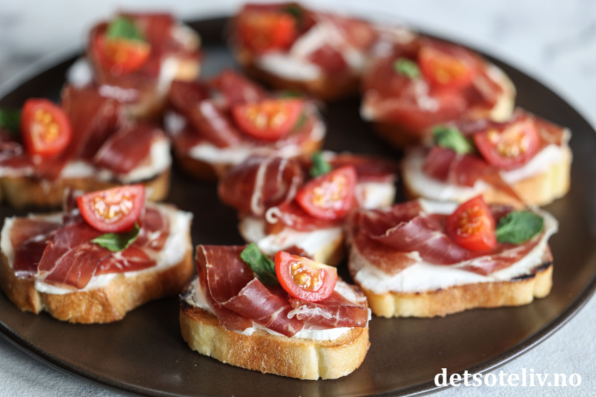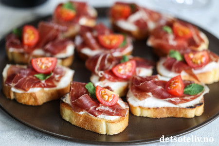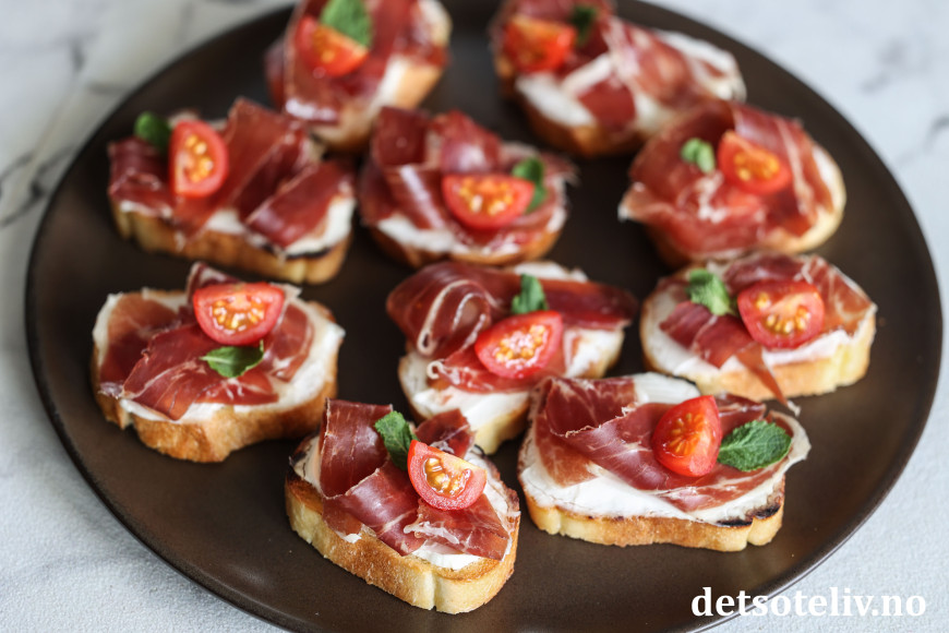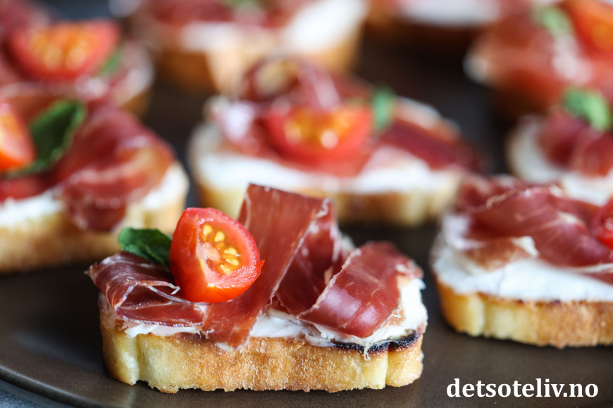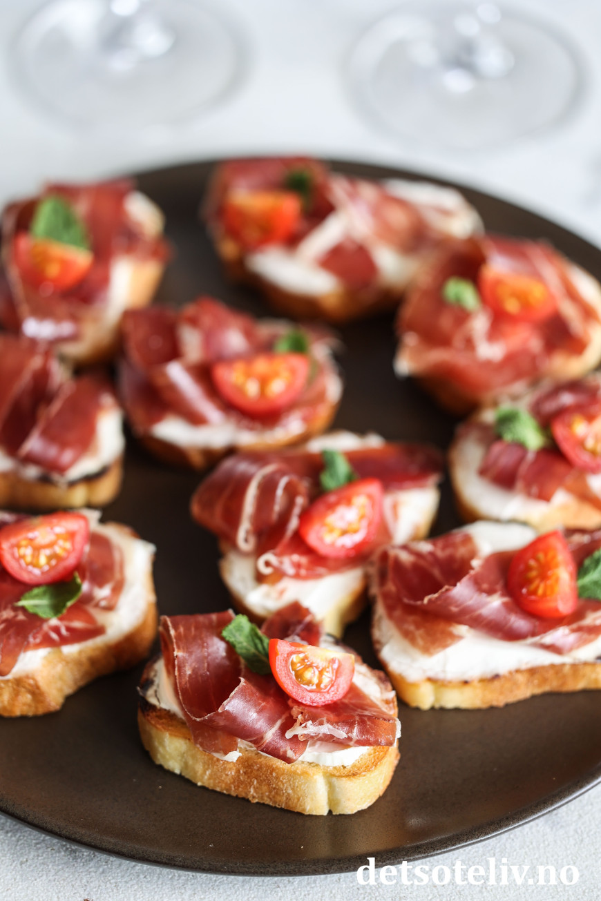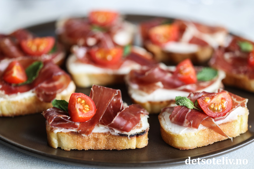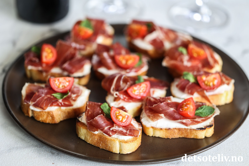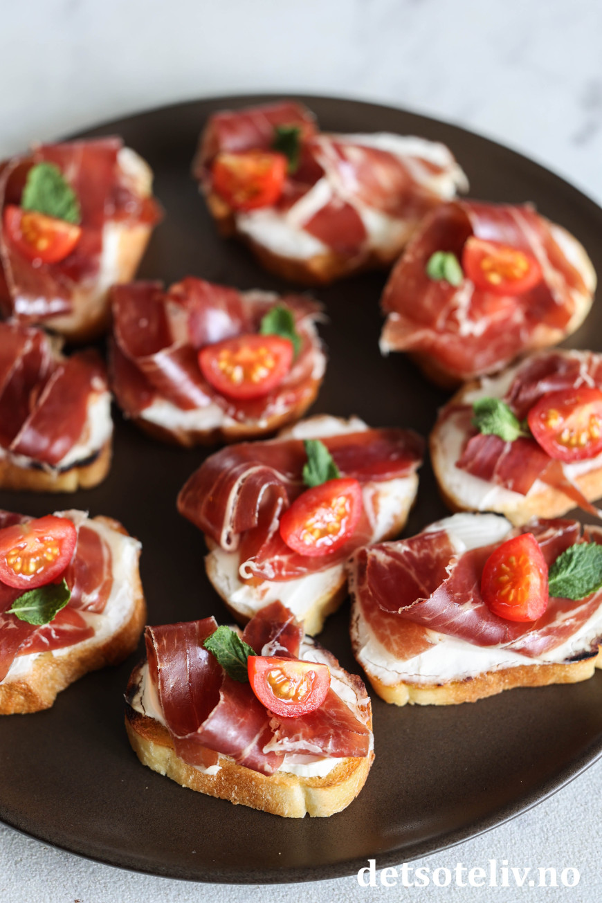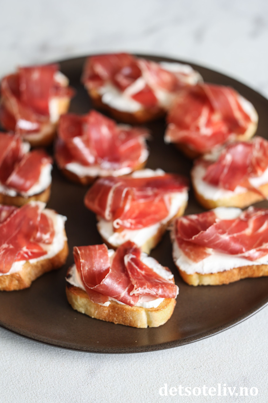 Her har jeg laget små, sprøstekte toast ("crostini") som jeg først har dekket med et lag mascarpone og deretter toppet med ekte Jámon Ibérico de Bellota. Mascarponen bidrar nydelig til skinken med sin kremete konsistens, uten å frata skinken noe av smaken (du kan alternativt bruke kremost naturell). Noen små cherrytomater og mintblader frisker opp på en diskret måte.
