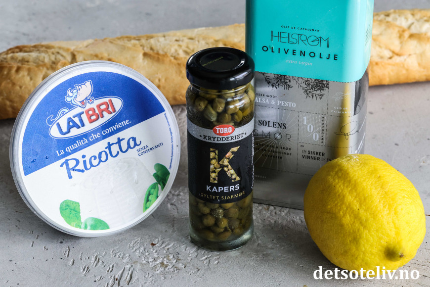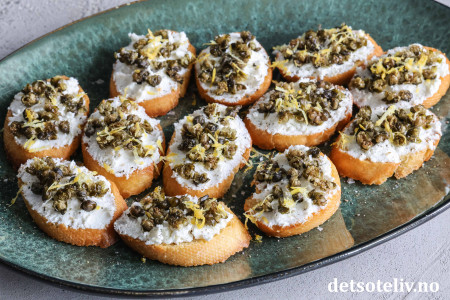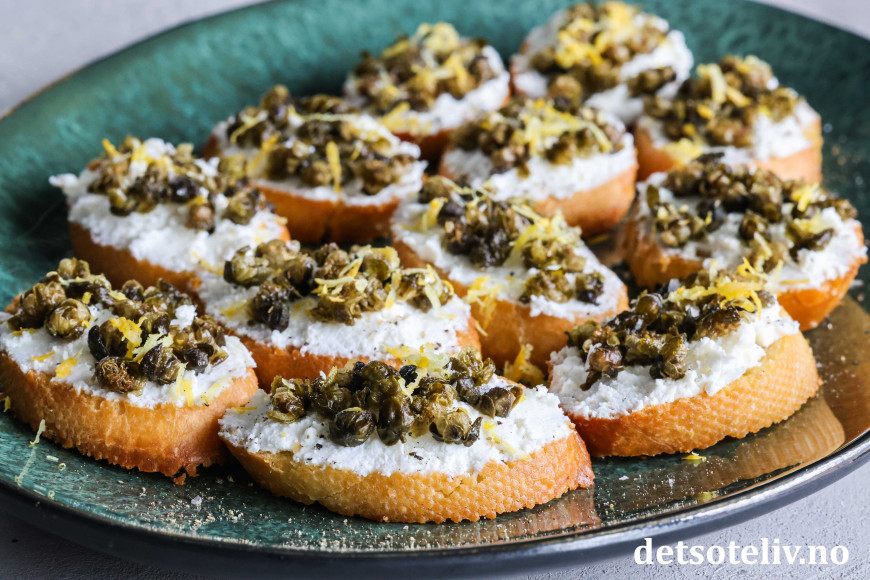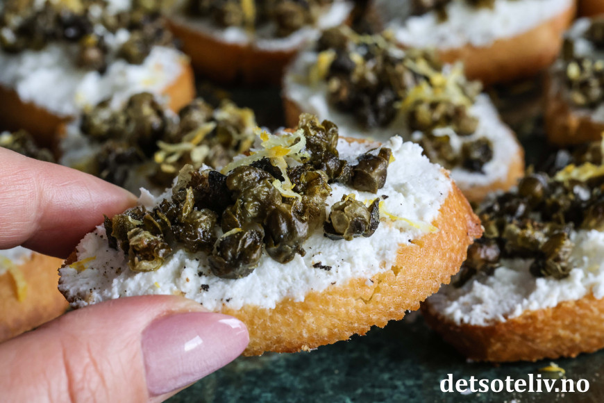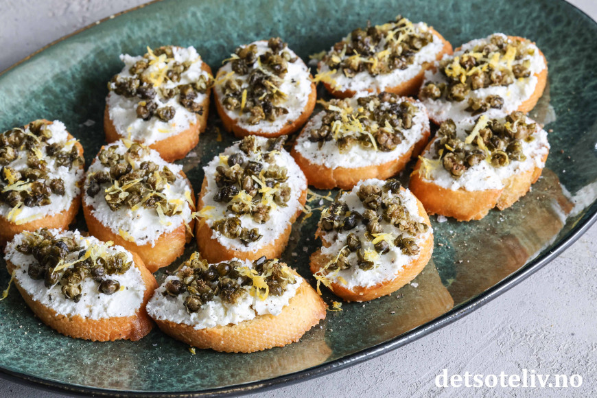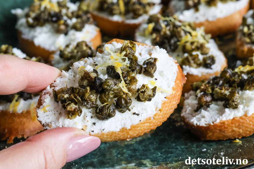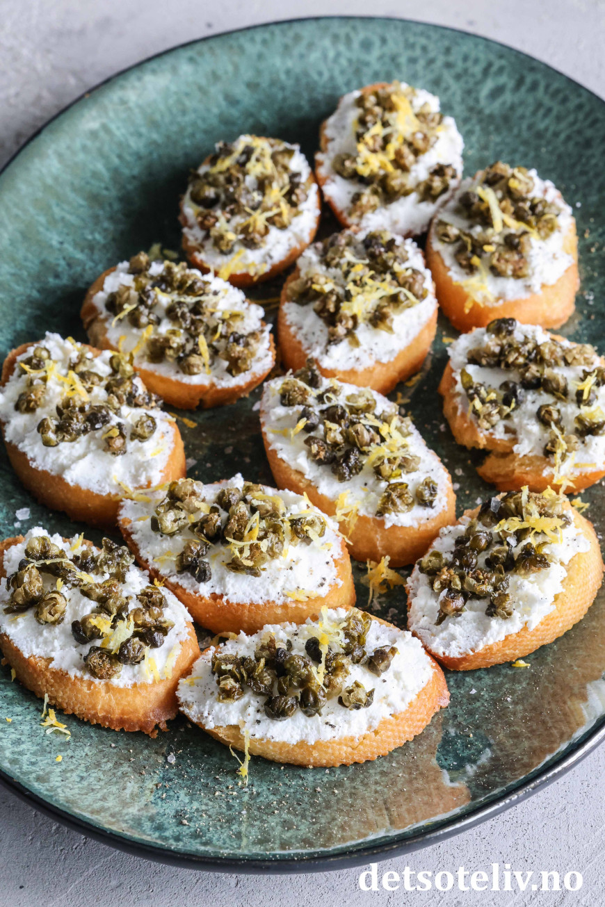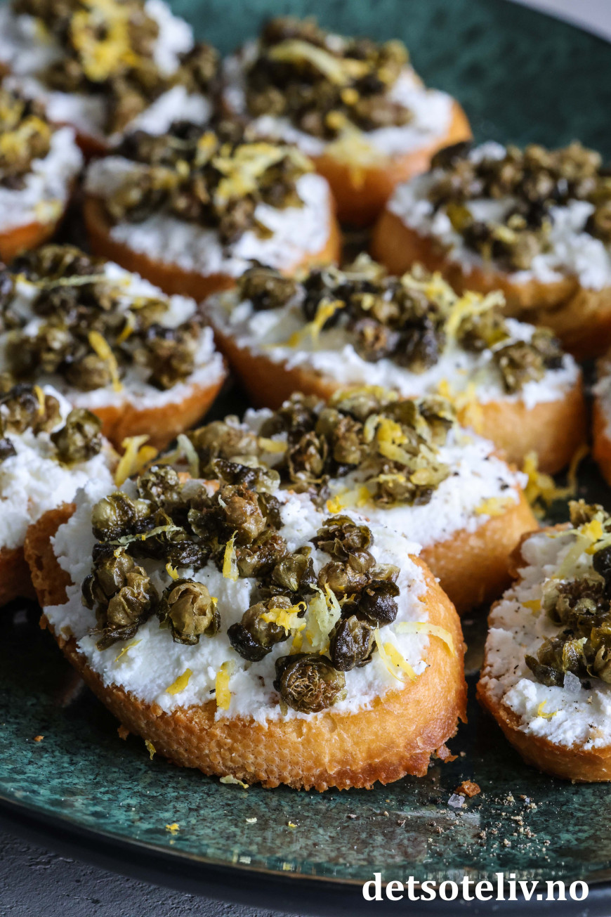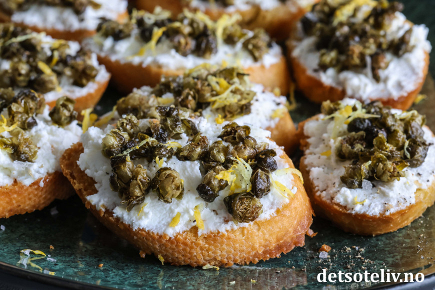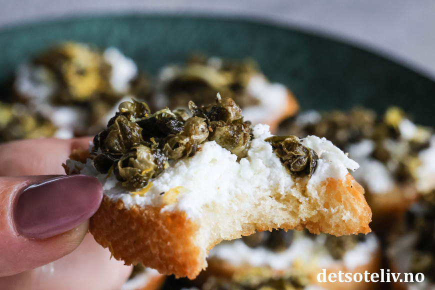 Sprøstekte, små baguetteskiver toppes her med ricotta og friterte kapers. Friterte kapers blir knasende sprø og smaker utrolig godt. Den milde smaken på ricottaen gjør at smaken på de friterte kapersene virkelig kommer til sin rett!