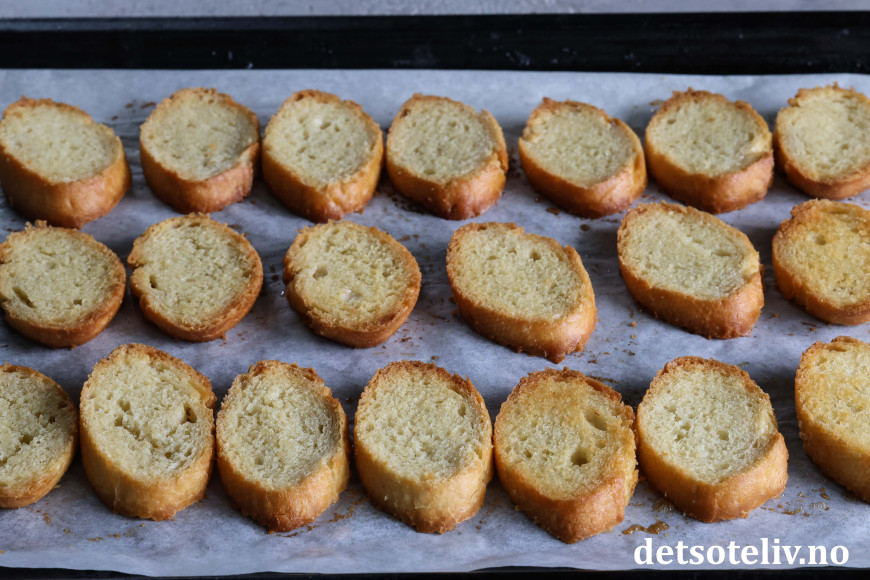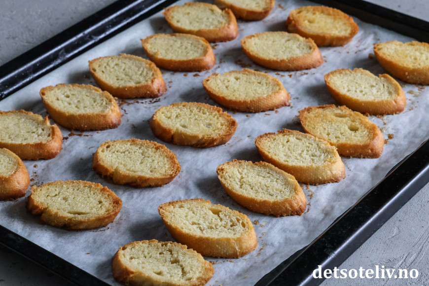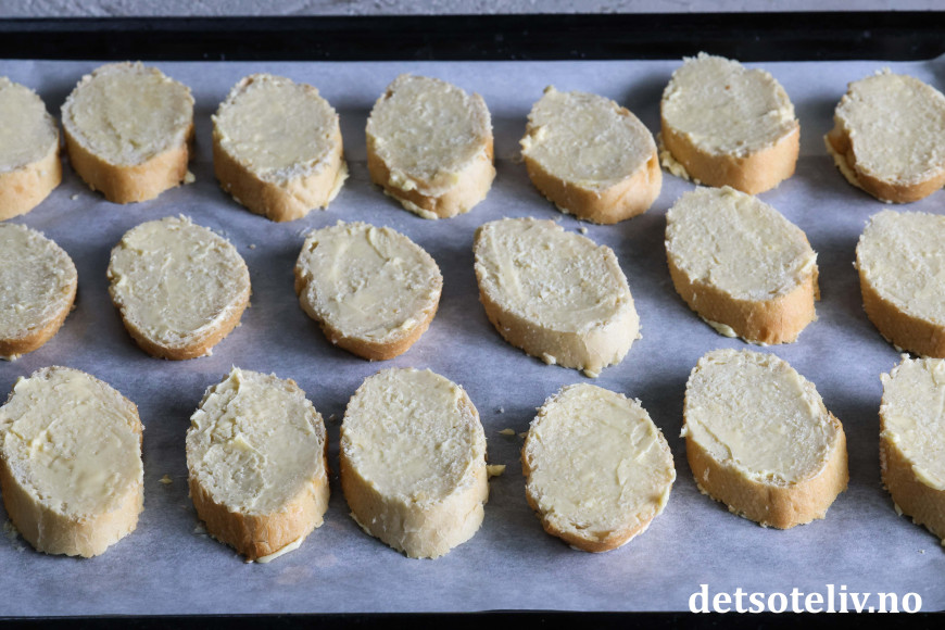 Legg de smurte baguetteskivene på en stekeplate.