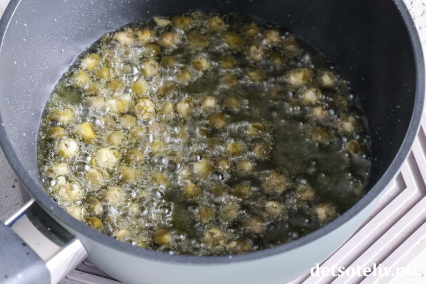Legg noen kapers i den varme oljen av gangen. Det vil frese litt når de treffer oljen. La kapersene steke i oljen i ca. 30–60 sekunder (avhengig av hvor varm oljen er og hvor store kapers du bruker). Vend forsiktig om på dem og følg godt med. Kapersene er ferdige når de er sprø og har åpnet seg som små blomster.