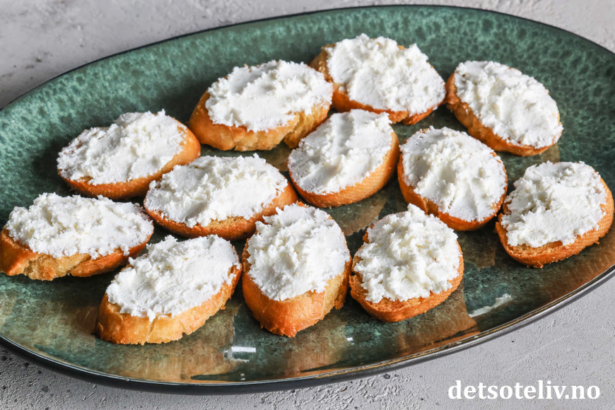 Smør ricotta på hver crostini.