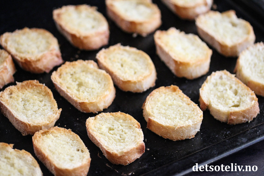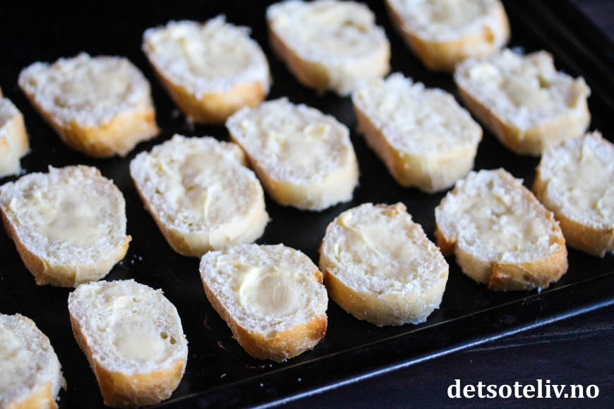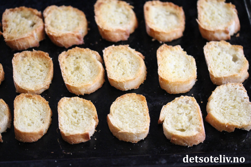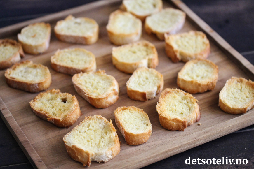 Før servering legges sprøstekte baguetteskive på serveringsbrett.