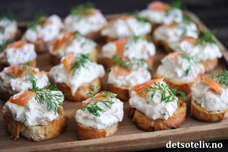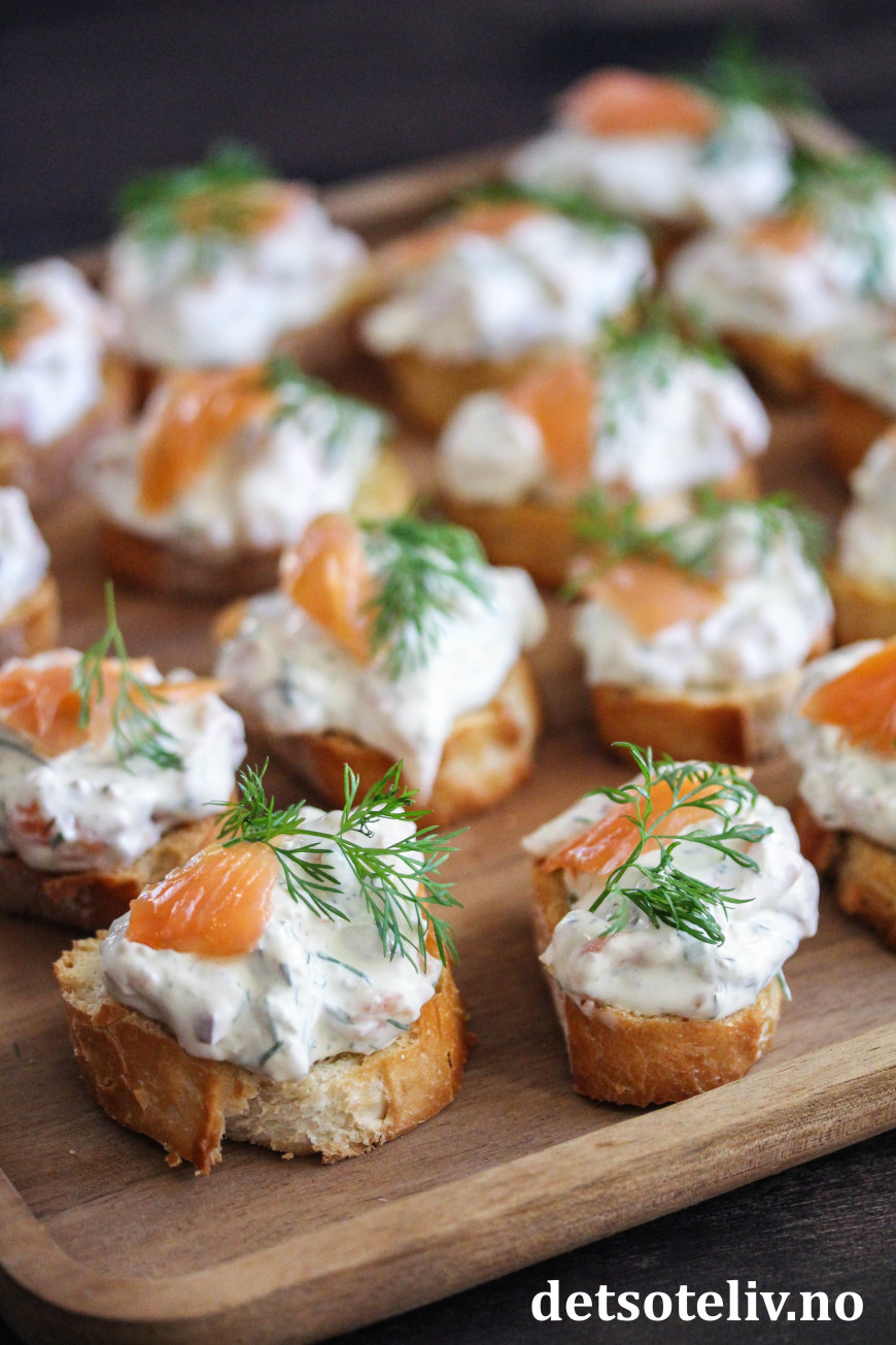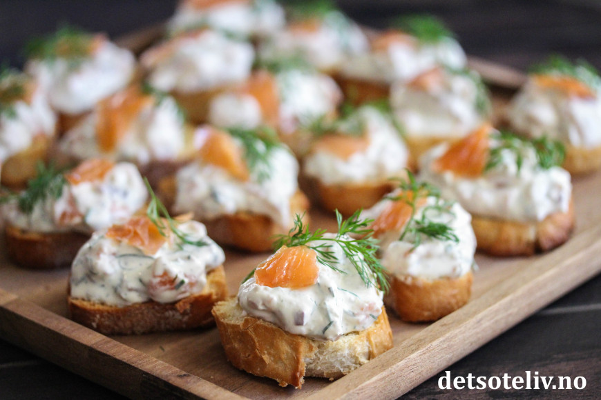 Før servering dekkes hver sprøstekte baguetteskive med en stor spiseskje røkelakskrem.