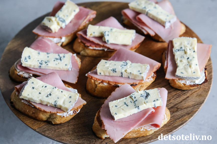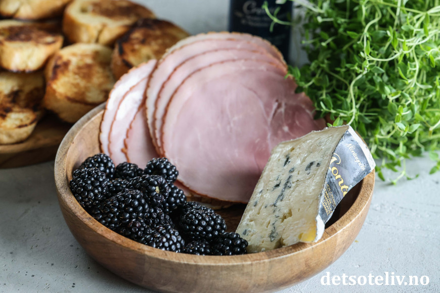♥ Jeg har her brukt røkt skinke, som passer veldig godt på smak sammen med blåmuggosten. Får du ikke tak i dette, kan du bruke annen type skinke.