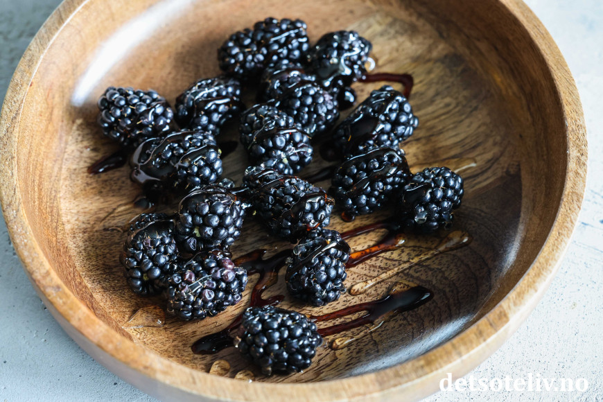 Legg bjørnebærene i en skål. Ringle over balsamico glaze og flytende honning.