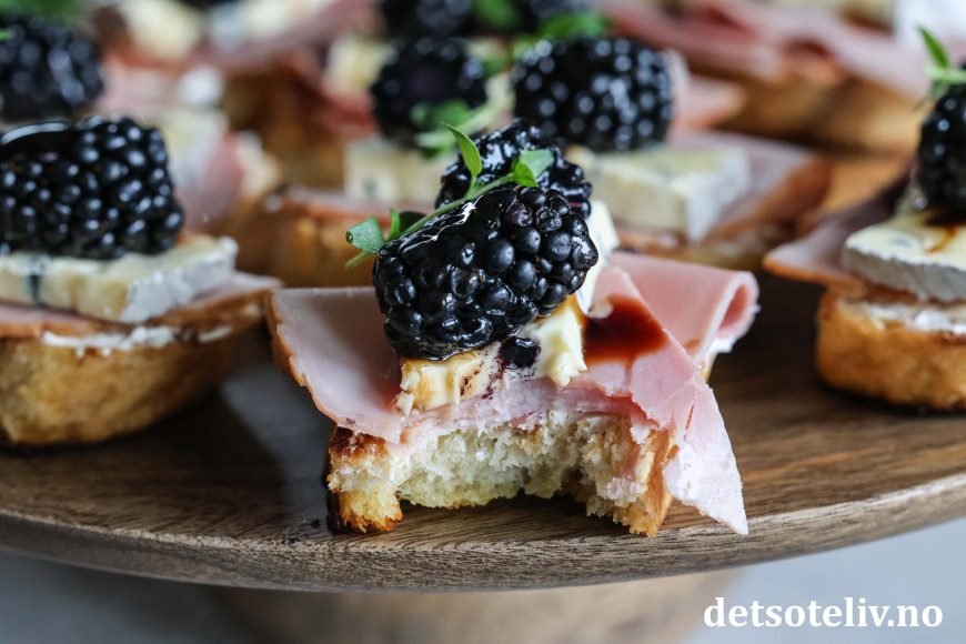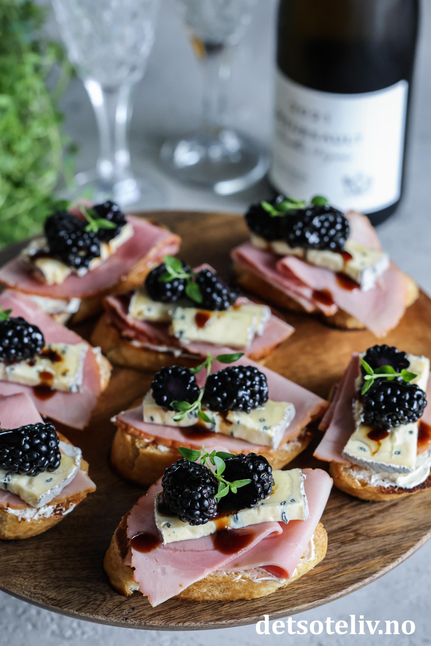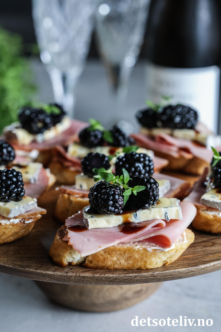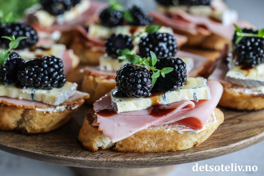 Her har laget noen små, sprøstekte toast ("Crostini") med et tynt lag kremost, røkt skinke og Montagnolo, og så toppet med glaserte bjørnebær.