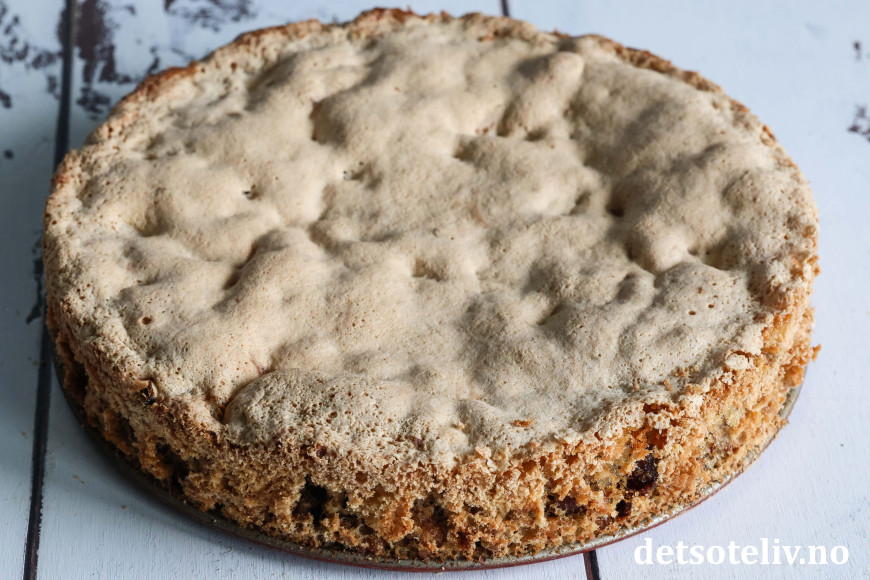 Hell deigen i en rund kakeform (22 cm i diameter) med bakepapir i bunnen. Stek kaken på rist midt i ovnen ved 175°C i 30 minutter. Avkjøl kaken helt i formen. Løsne kaken fra formen med en skarp kniv. Ta den ut av formen og fjern bakepapiret. Sett kaken på et passende fat.