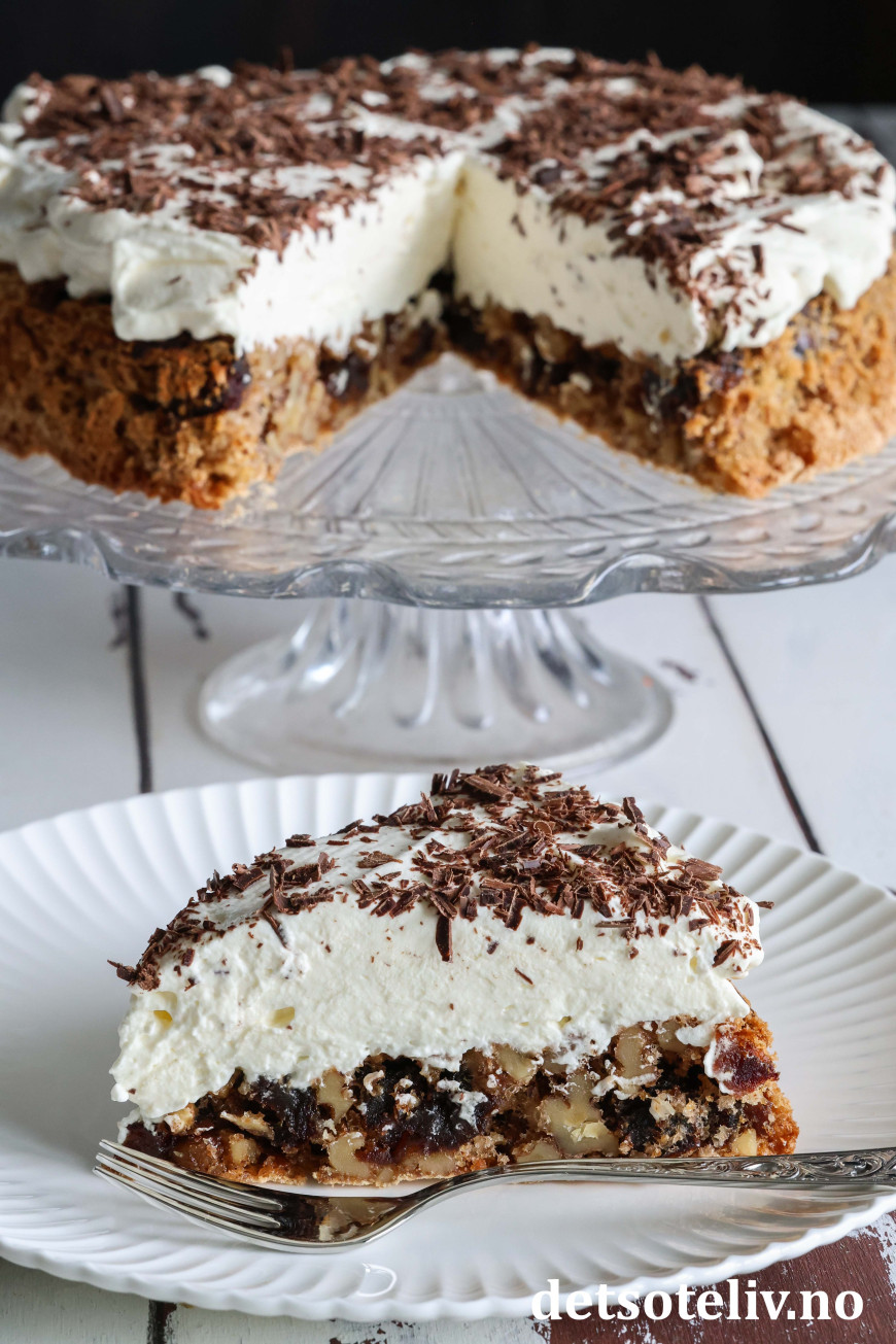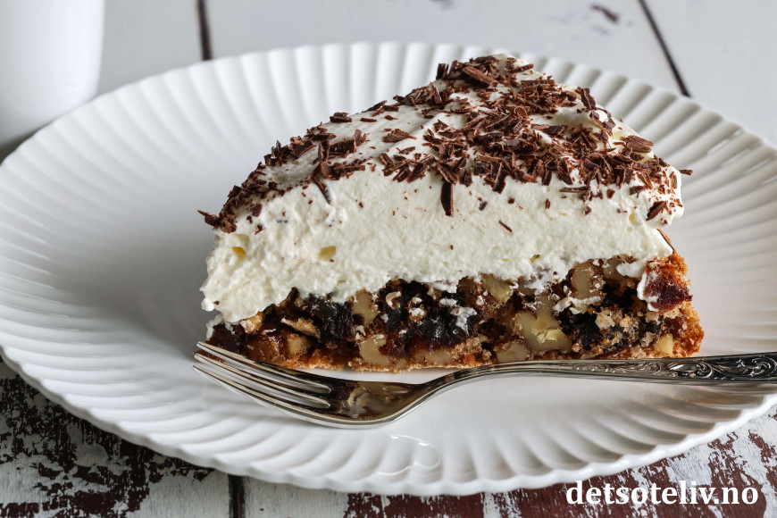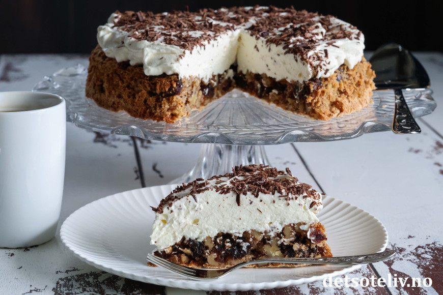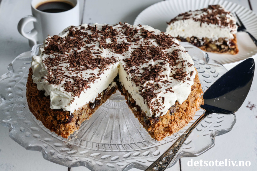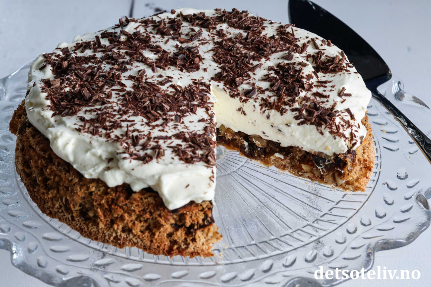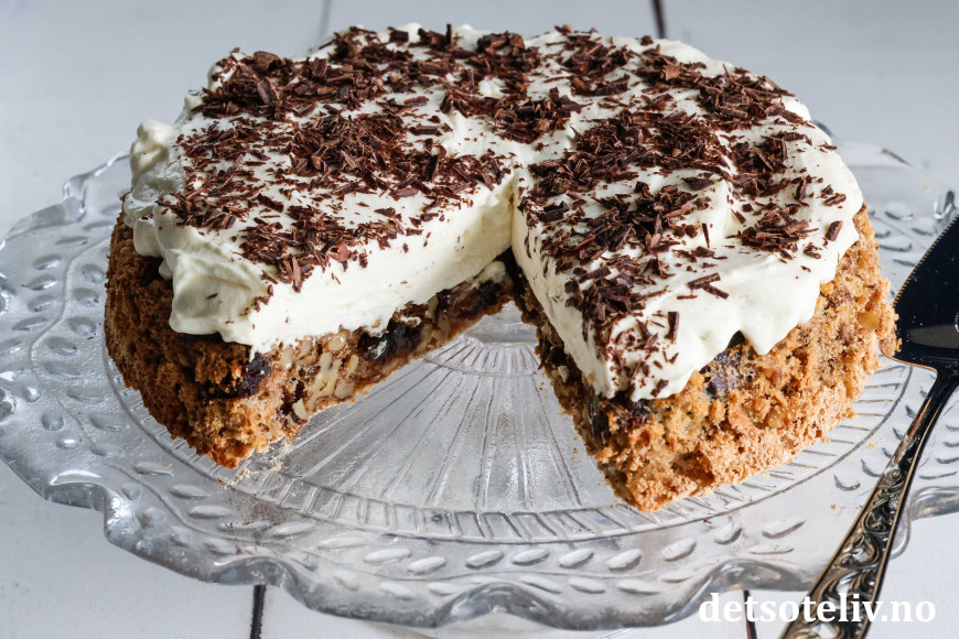 Kaken er utrolig myk og saftig og inneholder nesten ikke noe mel. Kakebunnen har lekker smak av dadler og valnøtter og smaker faktisk kjempenydelig som den er (du får da også en kake som inneholder nokså lite fett).